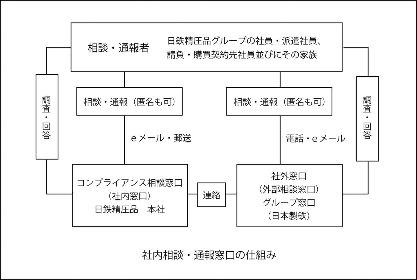 また、親会社である日本製鉄(株)に「コンプライアンスグループ窓口」も設置されており、当社を含めたグループ会社社員とその家族の身近な相談や疑問を受ける体制も整備しています。