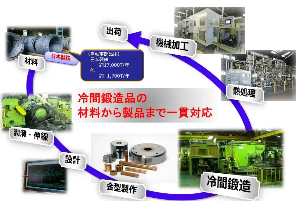 材料→潤滑→伸線→冷間鍛造→熱処理→機械加工を社内で一貫製造し、高品質・低コストを実現。